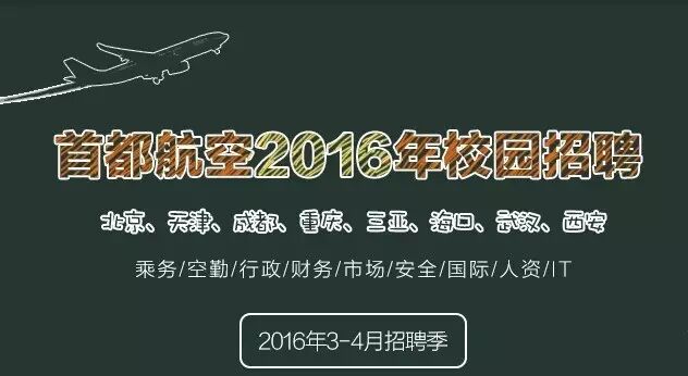 2016年,首都航空将赴全国各地开展校园招聘,欢迎广大应届生应聘首都航空。