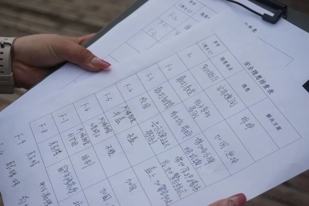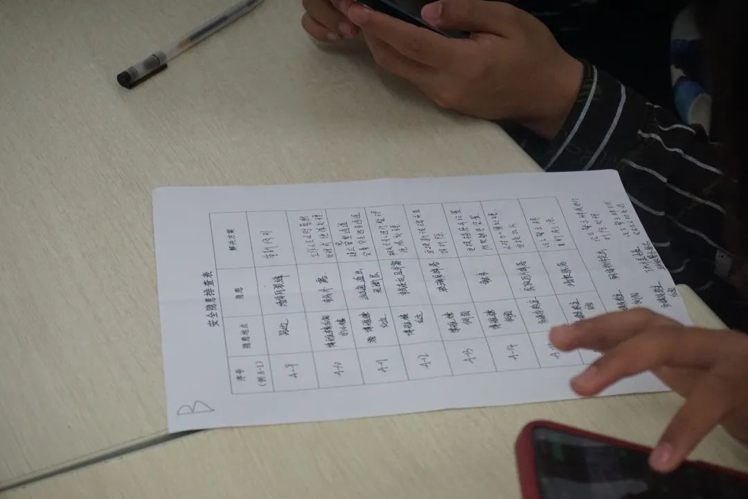 8:30,“行走的安全帽”志愿服务团队组织28名志愿者,将其随机分成七个小组。志愿者们结合专业特色,灵活运用所学知识,对学校的用电场所、垃圾存放场所、教学楼、校门口及周边危险水域、交通设施进行排查,对学校的消防设施等进行全面检查,发现安全隐患进行拍照并详细记录。最后,志愿服务部对隐患进行分类整理,汇总安全隐患排查报告,根据隐患提出合理的解决方案。