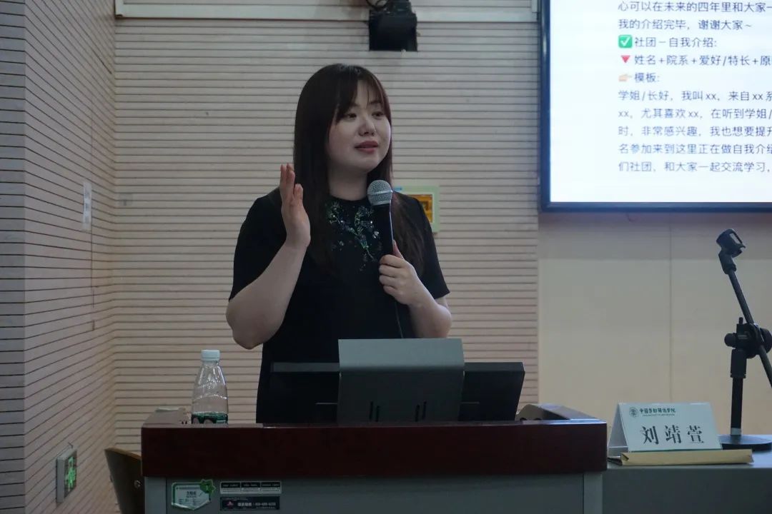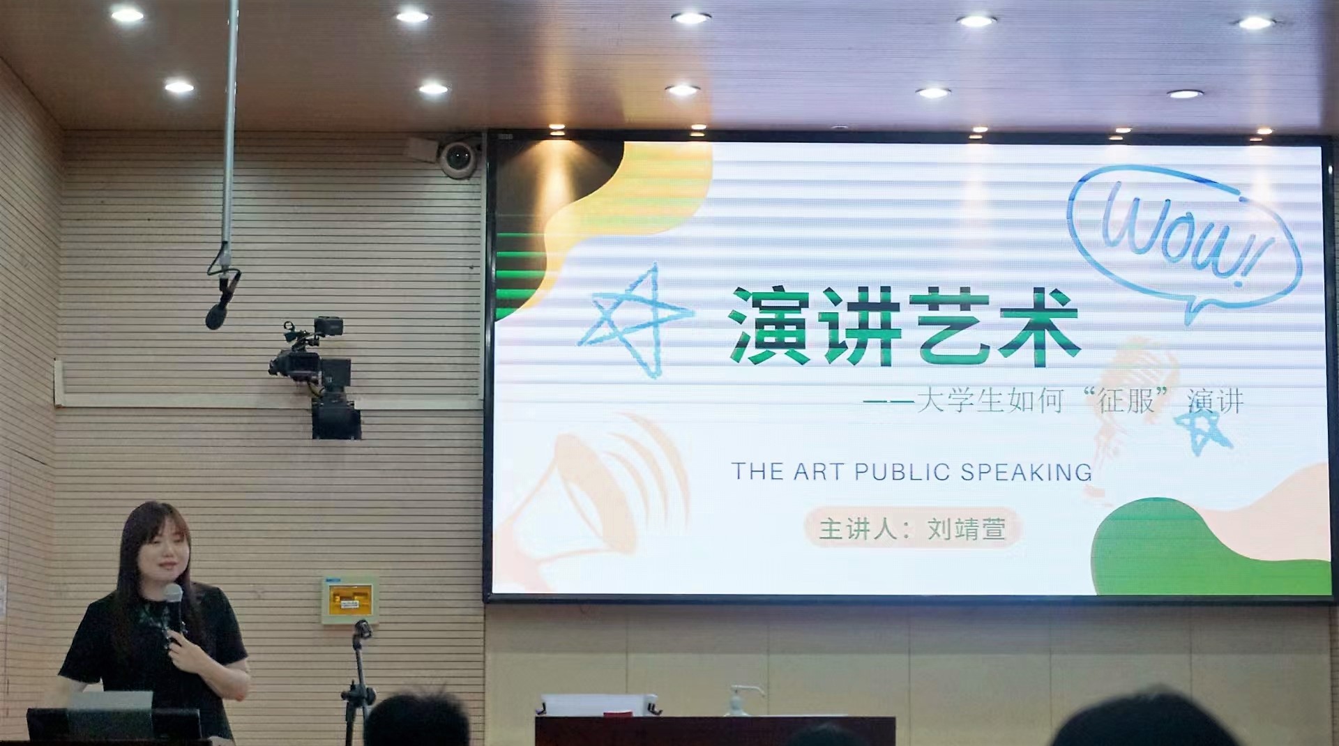 刘靖萱老师以《演讲艺术——大学生如何“征服”演讲》为题开始讲座,她表示,演讲是一种综合现实性与团体性的艺术表现形式,自我介绍也是演讲中至关重要的一部分。刘老师指出,通过对演讲者进行基本技巧训练,可以提升演讲者的自信、责任与表达能力。讲座中,刘老师邀请了两位同学上台实战演讲和自我介绍,并进行现场指导。课程在热烈气氛中结束。