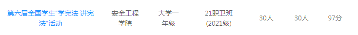 截至11月25日,全院学生共有426人通过教育部全国青少年普法网在线学习,并进行“宪法卫士”在线测评获得金牌。其中,2021级职业卫生工程班在此次比赛中以100%的全员参与率,平均分达到97分,成为学院“宪法卫士金牌班级”。
