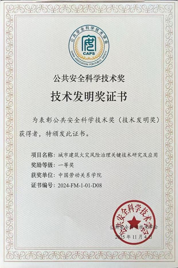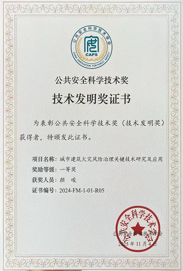 大会举行了2024年度公共安全科学技术奖颁奖仪式,颜峻副教授参与完成的《城市建筑火灾风险治理关键技术研究及应用》项目凭借突出创新价值与实践成效,荣获技术发明奖一等奖。该项目聚焦城市建筑火灾治理痛点,构建了城市建筑火灾灾变链理论模型,明确风险量化评估关键要素与推理逻辑,实现风险治理“重心下沉”与管控“关口前移”;创新基于物联网监测的风险评估方法与模型,破解量化评估与保险费率厘定难题;研发“数据驱动+物联”早期火情监测预警技术装备及一体化智能平台,有效填补城市建筑火灾治理数智化装备空白,已在多个重点工程中推广应用,为城市安全发展提供了重要技术支撑。项目合作单位包括清华大学、清华大学合肥公共安全研究院、中国人民公安大学等多家高校及科研机构,是产学研深度融合的成功典范。