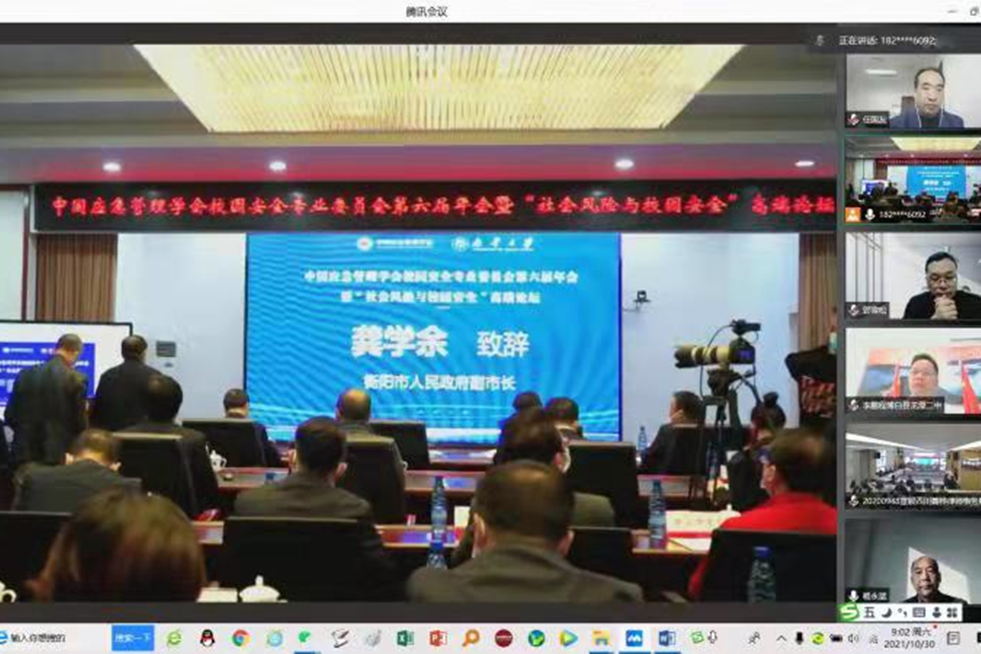 10月30日,中国应急管理学会校园安全专业委员会第六届年会暨“社会风险与校园安全”高端论坛在南华大学举办。大会以“教育风控与应急处突”为主题,因疫情防控形势需要,采取线上方式进行。国家教育行政学院原党委书记、常务副院长黄百炼,中央党校(国家行政学院)应急管理培训中心(中欧应急管理学院)副主任(副院长)、中国应急管理学会秘书长杨永斌,衡阳市人民政府副市长龚学余等出席会议。280余名专家学者参与线上交流。