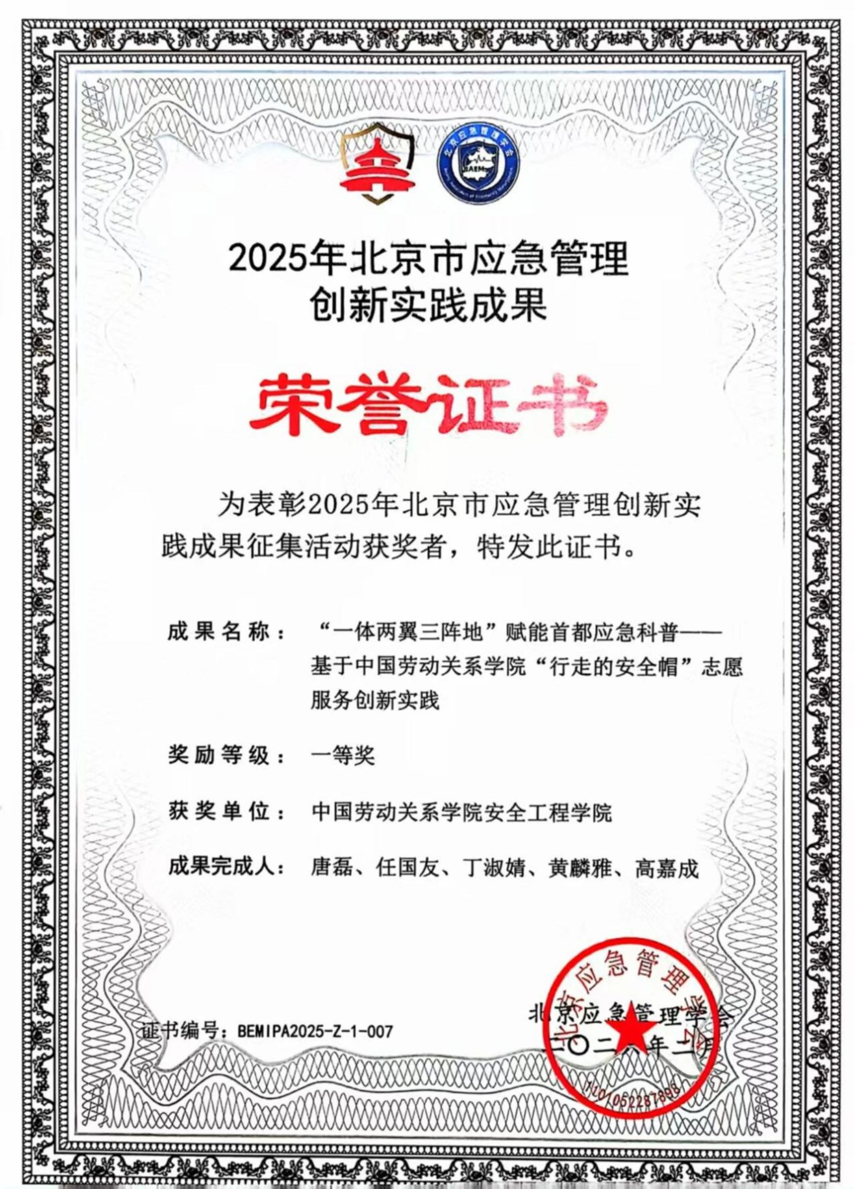 为进一步推动北京市应急管理事业创新发展,北京应急管理学会开展了2025年北京市应急管理创新实践成果评选。由我校安全工程学院申报的《“一体两翼三阵地”赋能首都应急科普——基于“行走的安全帽”志愿服务的创新实践》项目,凭借鲜明的创新理念、扎实的实践成效与广泛的社会影响,荣获最佳实践一等奖。