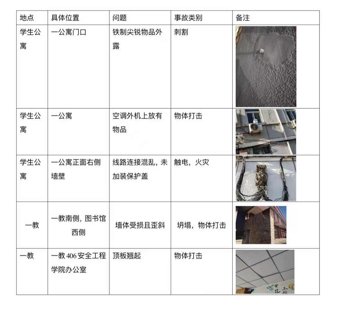 5月12日起,生活权益部在涿州校区进行了全面的安全隐患排查。排查的区域包括教学楼、学生公寓、图书馆、食堂、澡堂等人流密集区域,最终发现8处安全隐患,将其整理并提出相应整改建议形成报告提交学校相关部门。