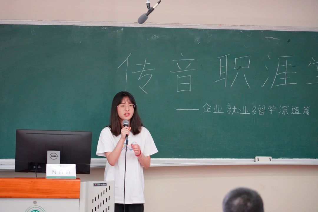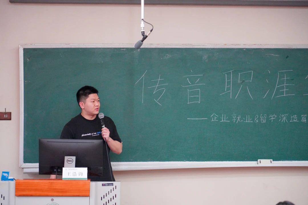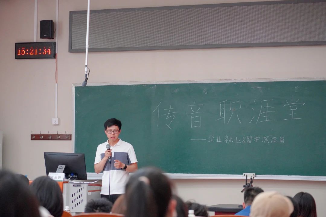 校友刘福鹏、梁昕光、冯苗苗以及2019级优秀学生代表谭锦思为大家带来企业就业的经验分享。他们结合自身的实习就业经历,从就业准备、信息搜集、简历制作、面试技巧、就业选择等方面给出自己的建议;校友杨雨昕和2019级优秀学生代表王浩钧则在留学深造方面做分享交流。他们从自身就读学校情况作为切入,详细介绍了留学申请的准备过程以及留学时期的生活基本情况,着重强调了留学的未来发展以及优势,告诉各位同学们也可将留学作为未来的发展方向选择之一。最后,各位校友也纷纷勉励大家要找准定位,锚定目标,大胆尝试,充分准备,并珍惜应届身份,尽早适应身份转变。