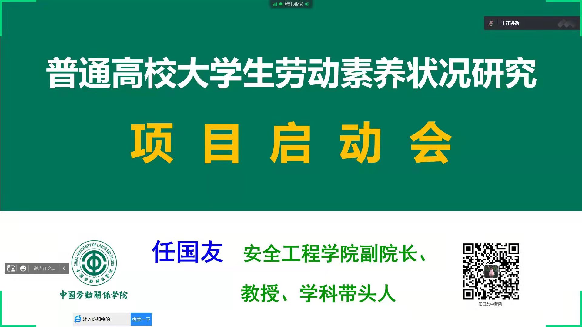 任国友教授首先对课题研究背景与现状、课题研究主要任务、数据采集与统计分析、研究报告框架与撰写要求以及项目实施过程注意事项进行重点说明。在自由交流环节,广大项目成员提出许多宝贵建议,为进一步开展“高校大学生劳动素养状况调查”奠定了基础。