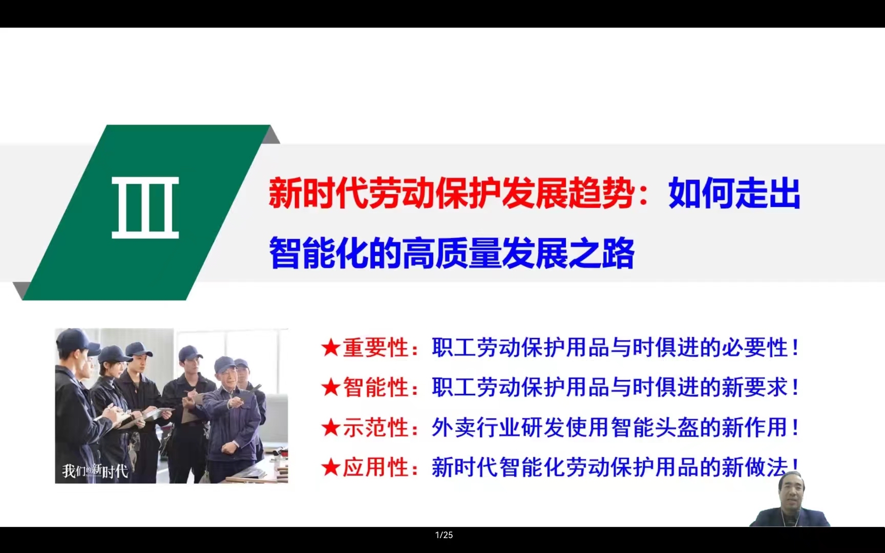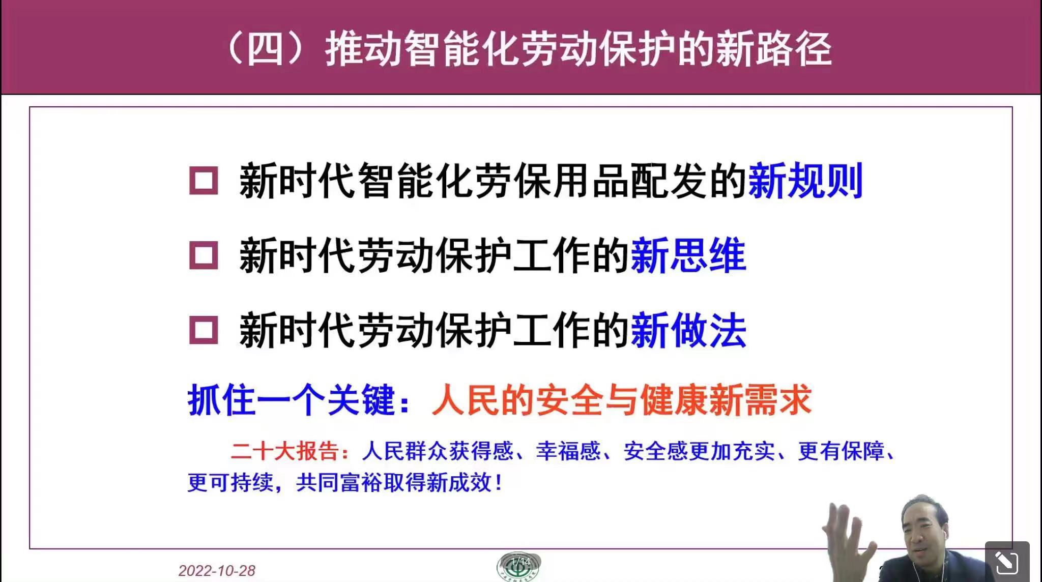 对应未来同学们在工会中的基本职责、工作内容和工作方法,任老师明确点出我院学生在该领域所具备的专业知识优势和能力支撑,为同学们在接下来的学习规划打开了思路,坚定了同学们的学习信心与恒心。接下来,他分析了传统劳动保护的“遇极端天气易失效”“劳保用品缺口大”“管理监督效率低”等几大难点,结合传统劳动保护面临的现实发展困境,明确提出要以职工劳动保护用品与时俱进的“必要性”“新要求”和新时代智能化劳保用品的“新作用”“新做法”四大核心为目标,走出一条有中国特色的新时代智能化高质量发展之路。