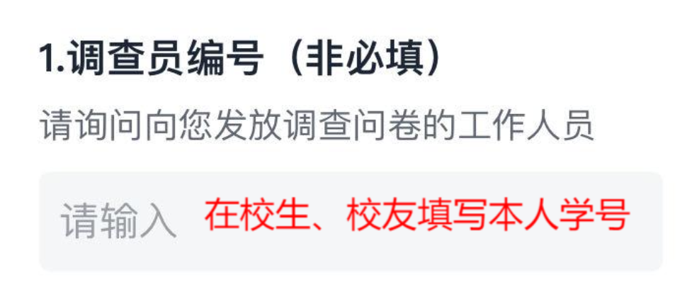 参评条件:(1)每位社会调研实践参与人完成不少于30份调查问卷(团队人数不超过5人,参评不少于100份)。为便于对参赛者所收集的调查问卷进行计数,请在调查问卷第1题“调查员编号(非必填)”中,填写学生、校友本人的学号(若无学号,可填写手机号),如图3所示;(2)提交一份不少于6000字的调研报告,调研报告的研究成果需注明来自“中国劳动关系学院第三届‘健安杯’大学生社会实践暨‘实践报国——在祖国大地上探寻青春答案’社会调查大赛”;(3)提交体现劳动者劳动过程的照片1~3张、微视频1段,需紧扣职业健康安全主题,融入劳动特色,调查员与被调查人员须同时出现。