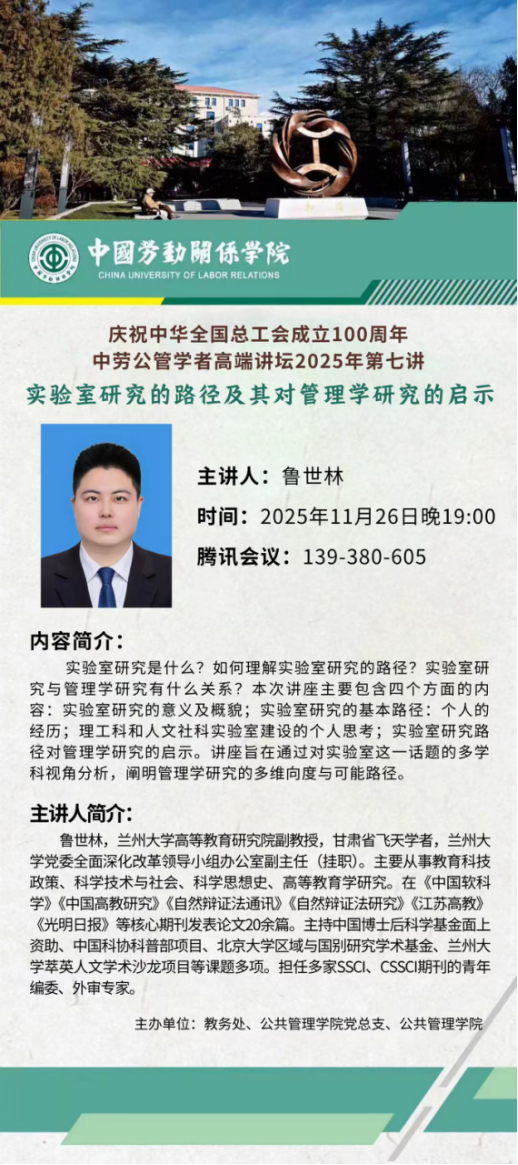 2025年11月26日晚,我院特邀甘肃省飞天学者、兰州大学高等教育研究院鲁世林副教授,开展题为《实验室研究的路径及其对管理学研究的启示》的专题讲座。讲座由公共管理学院王中女老师主持,共百余名师生参与。