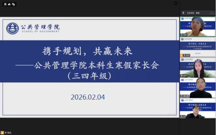 一二年级家长会聚焦学生大学适应与成长筑基关键期,围绕学风建设、评奖评优、假期安全及好习惯养成等重点与家长深入交流。赵莹向家长同步学院发展规划,介绍了我院与北京师范大学政府管理学院的签约合作情况;聚焦假期赋能,她建议家长与学生深度沟通,引导其制定科学假期计划,树立初步职业规划意识,同时着重强调安全底线,呼吁家校携手筑牢学生人身、消防、防诈、心理及政治安全防线。她希望家长做孩子的“人生教练”,多关注学生综合素质提升,与学院保持常态化沟通,凝聚育人合力,并代表学院向全体家长致以新春祝福。张杰通报低年级学生学业预警情况,介绍了学院班主任—学业导师双轨责任制、榜样引领、诚信教育、以赛促学等学风建设举措,明确学业警示制度与学分、学位相关硬性要求,针对部分新生存学习动力缺失问题,希望家校协同督促学生珍惜大学时光。刘博伟、韩汝旭分别就学院评奖评优情况、假期及校园安全相关规定向家长作详细说明。