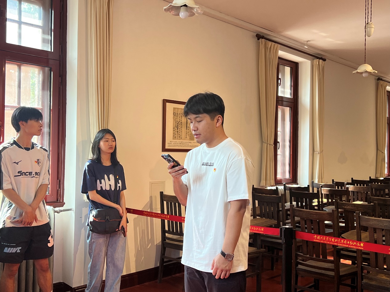 参观结束后,学员们齐聚大教室开展学习讨论,大教室是红楼内面积最大的一间教室,能容纳七八十人同时上课,这间教室里常常挤满了求知若渴的进步学生。在国泰民安的今天,预备党员们在这间教室中,分享着自己经过本次社会实践学习的感悟。