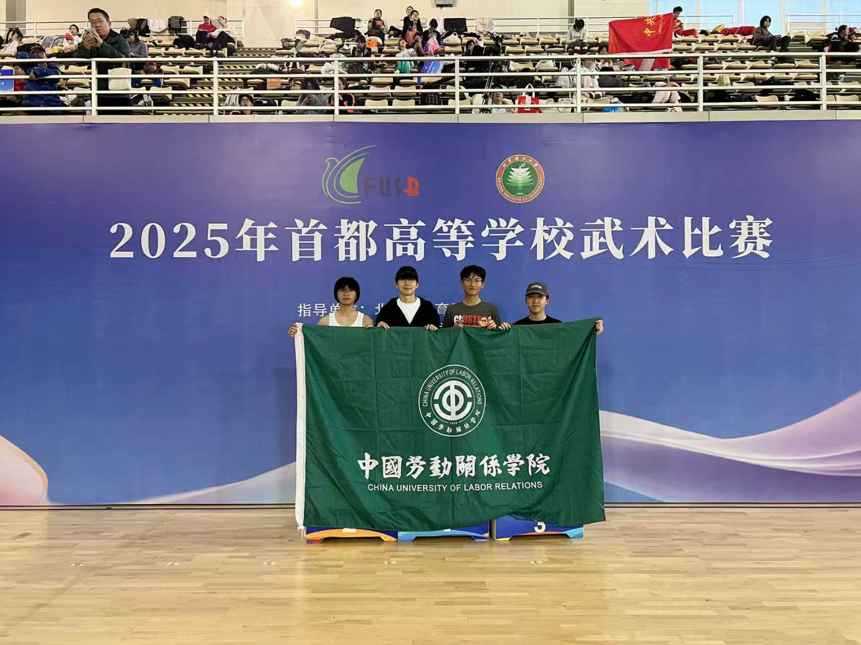 2025年11月8日,由北京市大学生体育协会主办、北京理工大学承办的2025年首都高等学校武术比赛顺利举行。来自清华大学、北京大学、北京理工大学等44所首都高校的500余名运动员、教练员齐聚一堂,以武会友,切磋技艺。中国劳动关系学院在领队盖清华老师和教练员初龙老师的带领下,选派运动员张凯伦出征男子散打项目。经过多轮激烈对决,张凯伦发挥出色,一路过关斩将,最终夺得男子散打65公斤级冠军,为学校赢得了珍贵的荣誉。