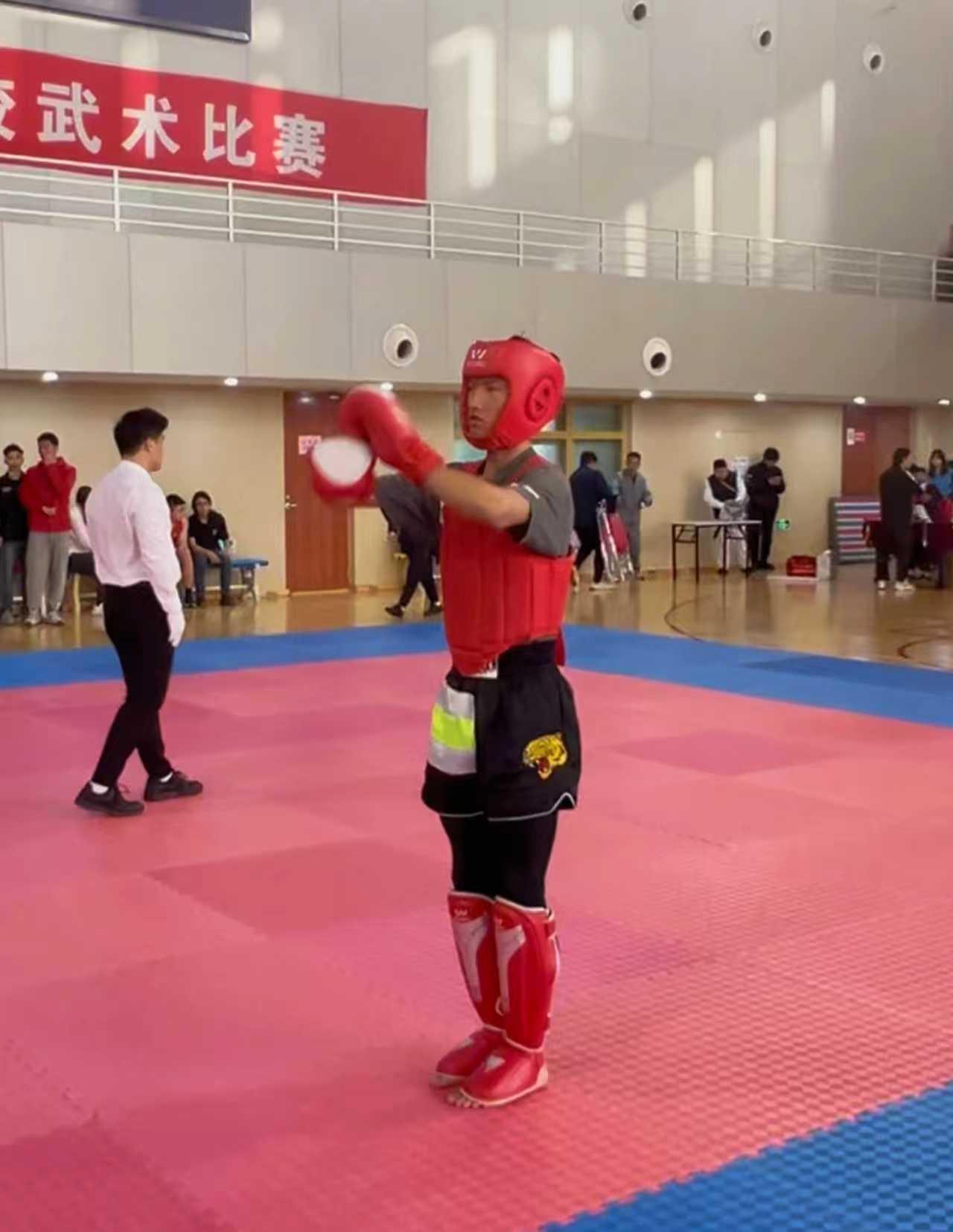 本届比赛设有武术套路和散打两大项。在备受关注的散打比赛中,设有男、女共5个公斤级别,竞争异常激烈。在男子散打65公斤级的激烈角逐中,张凯伦同学历经4轮淘汰赛的层层考验,展现出扎实的武术功底与顽强的竞技精神。赛场上,他攻防转换迅猛、击打精准有力,面对强手沉着冷静,凭借灵活的战术布局和坚韧的意志品质,在多场关键对决中顶住压力、奋勇拼搏,一路过关斩将,成功摘得该级别桂冠。每一次凌厉的出击、每一次坚毅的防守,都彰显着我校学子昂扬向上的精神风貌,也印证了初龙老师科学系统的训练成效。
