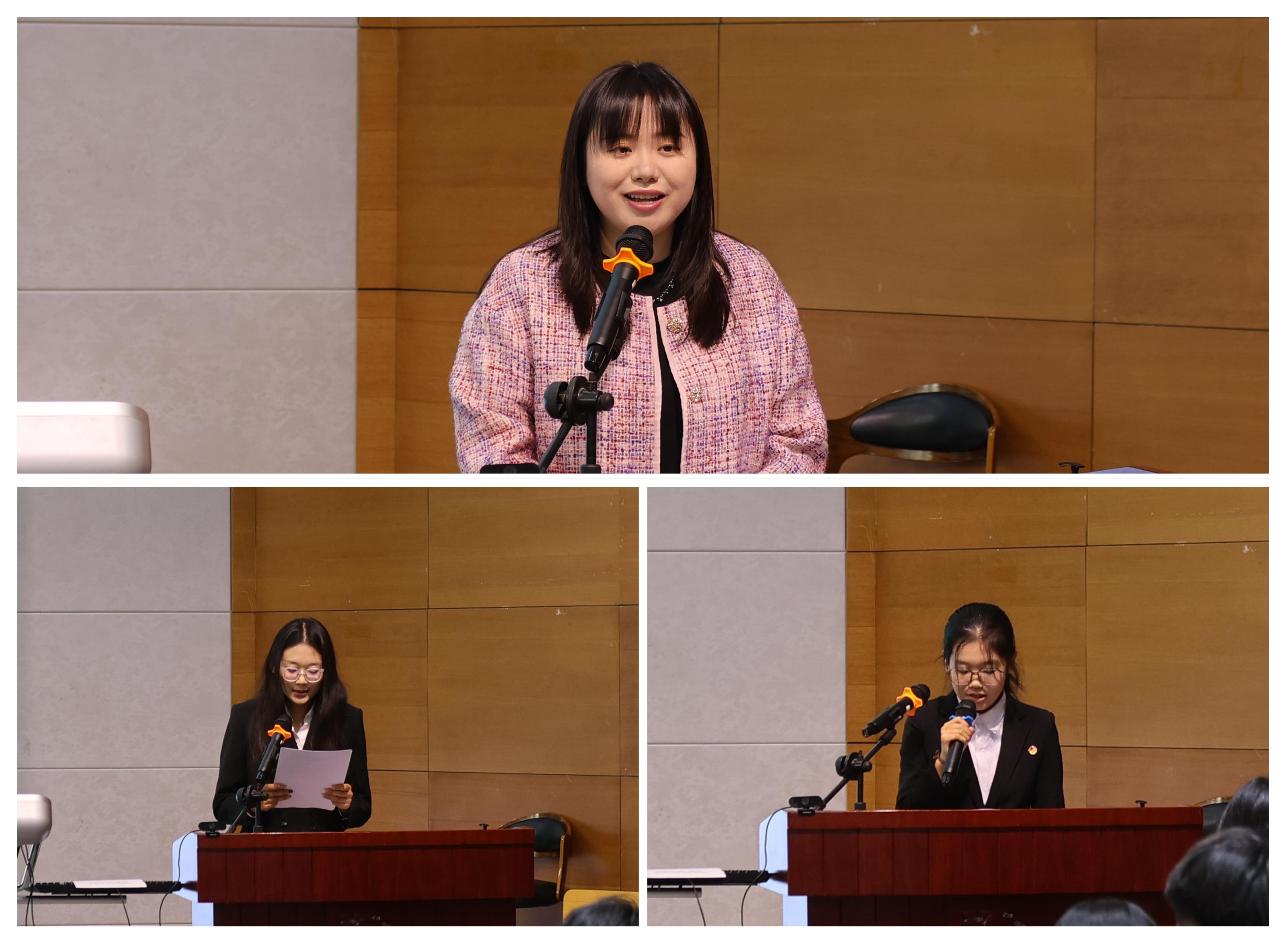 法学院2024级李鹤燃、公共管理学院2024级尹默涵作为驻地志愿者代表先后发言。她们结合自身经历,分享了志愿服务中的成长感悟与温暖故事,言语间满含坚定与热忱,传递出新时代青年的青春正能量。