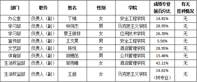为进一步落实共青团中央、教育部、全国学联《关于推动高校学生会(研究生会)深化改革的若干意见》,明晰学生会组织定位和职能,优化学生会组织体系,规范学生干部的选拔、考核和培养制度,经个人报名、资格审查、线上面试、竞选演讲、投票选举等环节,学生会第十九届部门负责人(副)换届选举工作现已结束,现将试用名单公示如下: