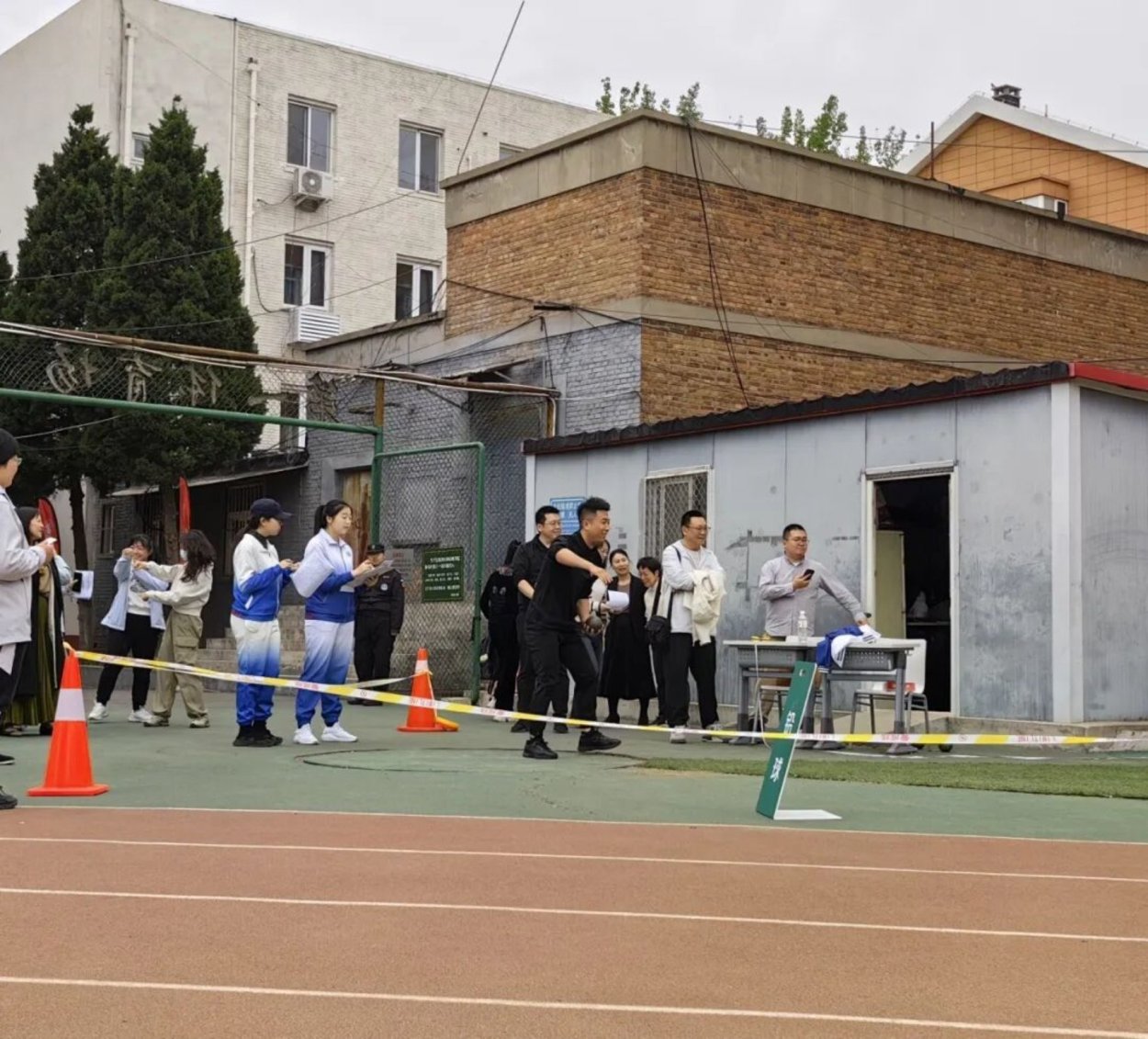 志愿者们仔细观测铅球位置、测量铅球距离,为铅球赛事提供高效、优质的服务。