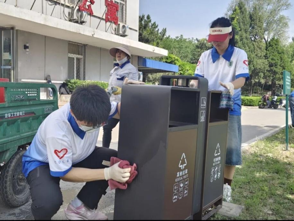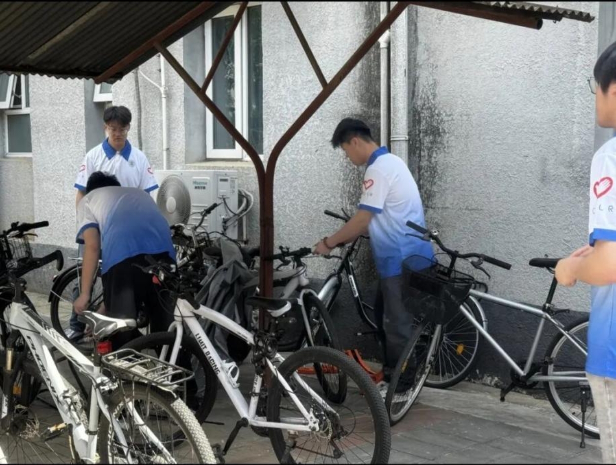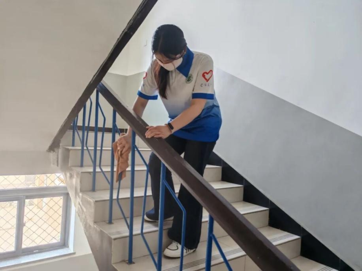 在宿管阿姨的带领下,志愿者们开展了环境维护工作,一部分同学负责擦拭楼梯扶手,仔细清洁每个角落;一部分同学清洁空调外机,踮起脚尖擦拭积尘;还有一部分同学负责摆放车辆,将自行车停放至指定区域。志愿者们分工明确又紧密配合,大家不仅让宿舍环境焕然一新,更在实践中发现了劳动的智慧。