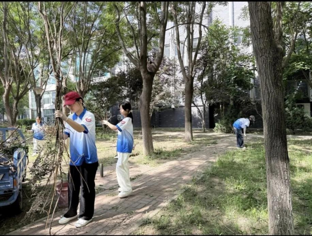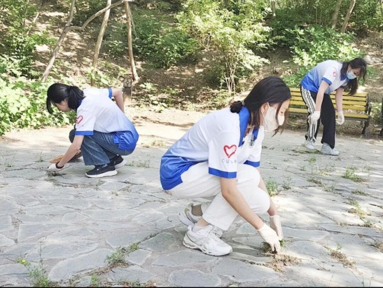 志愿者们沿着校园主干道清扫道路上的垃圾、杂物,在水上公园周边区域清除杂草,让校园焕发出更加蓬勃的生机。