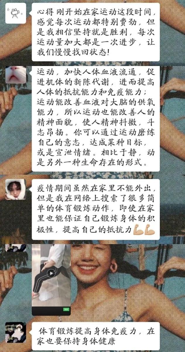 概述:每日实行健康运动打卡制度,收集支部成员健康状况信息,在认真配合完成学校开展的疫情信息统计工作的基础上,进行居家运动打卡计划,以支部为。单位做好统计。同时,动员团员积极参加家务劳动,勤开窗通风、勤洗手、常消毒,制作家庭卫生记录表,营造洁净健康的生活环境。