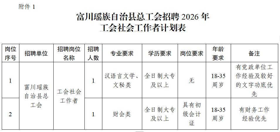 附件:1.富川瑶族自治县总工会招聘2026年工会社会工作者计划表