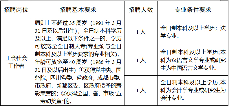 为进一步加强基层工会干部队伍建设,结合工作实际,新都区总工会拟面向社会公开招聘工会社会工作者3名。本次招聘工作委托成都香城人力资源开发有限公司按照公开、公平、公正原则具体实施,有关事项公告如下: