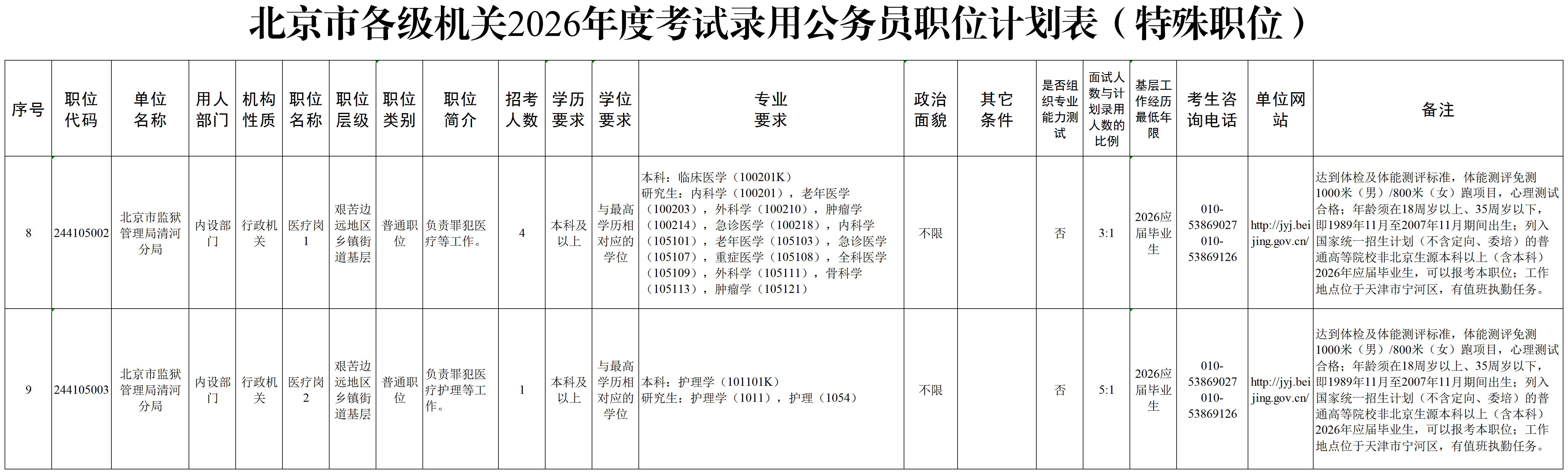 3.要求“基层工作经历最低年限”为“无限制”的招考职位,限于截至公务员考试报名时具有北京市常住户口、人事行政关系在北京的人员(不包括2025年非北京生源高校毕业生及户口档案保留在学校的非北京生源往届高校毕业生)和符合面向2026年应届高校毕业生招考职位条件的人员报考。
