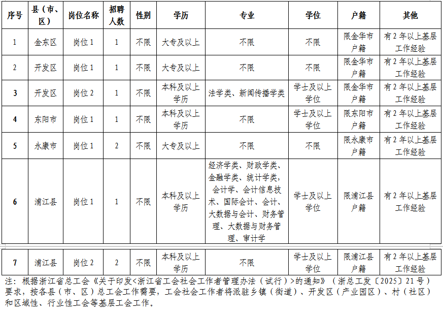因工作需要,金华市总工会现面向社会统一公开招聘工会社会工作者。根据浙江省总工会《关于印发<浙江省工会社会工作者管理办法(试行)>的通知》(浙总工发〔2025〕21号)要求,现将有关事项公告如下: