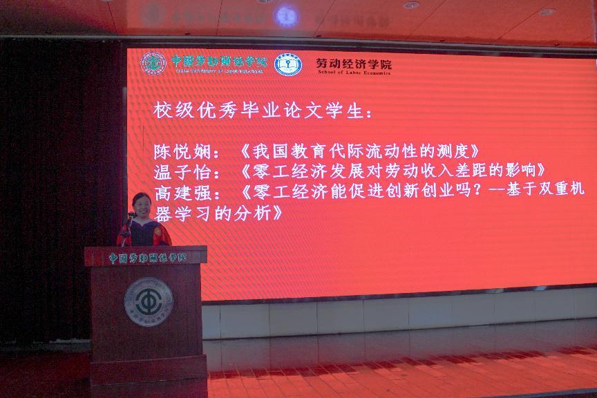 随后,劳动经济学院教学副院长韩文琰老师宣读了《中国劳动关系学院劳动经济学院关于表彰2024届本科生校级优秀毕业论文(设计)的决定》。陈悦娴、温子怡、高健强三位同学的毕业论文被评为校级优秀毕业论文。这些荣誉的获得不仅是对他们个人努力的肯定,也是对学院教学质量的认可。