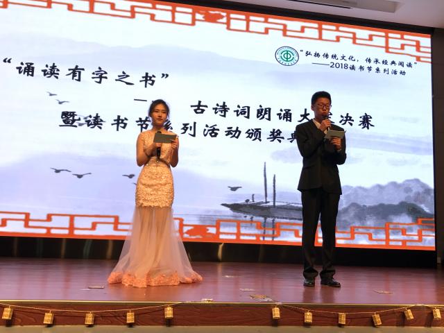 在随后展开的古诗词朗诵大赛决赛中,选手们以其铿锵有力的气势、充沛饱满的感情、自信大方的形象赢得老师和同学们的阵阵掌声。比赛内容和形式更是丰富多彩,有的朗读千古传颂的名篇,让我们在精简的语言当中解读古人的英伟事迹;有的表达思乡之情,轻悠的配乐中,吟诵者带领着我们走进诗人的心田,领悟诗人心中的感情;有的歌颂青春,引导同学们追求青春,勇敢拼搏......各位选手诵读形式多样,并适当配以音乐,穿插舞蹈等,充分展现了诗文朗诵的艺术感染力和舞台表现力。在比赛中还穿插了经典人物猜猜猜的活动,同学们积极参与,共同互动,精彩非凡。国学堂的同学带来的古典舞《礼仪之邦》婀娜多姿,充分体现了中华传统文化的魅力所在,赢得了观众的阵阵掌声。