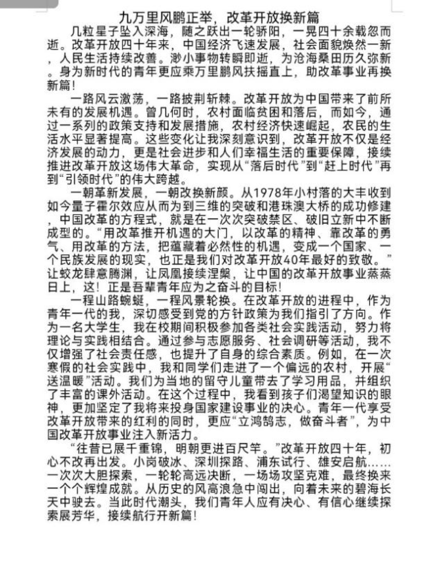 自活动开展以来,得到了劳经院学子们的积极响应和热情参与。同学们围绕改革开放的历史进程、当代青年的使命与担当、青年在社会发展中的积极作用等方面,撰写了一篇篇充满激情与理性的文章。这些作品不仅反映了改革开放的深远影响,更展望了新时代青年的广阔前景,展现了当代青年对国家和社会的深刻思考和积极行动。