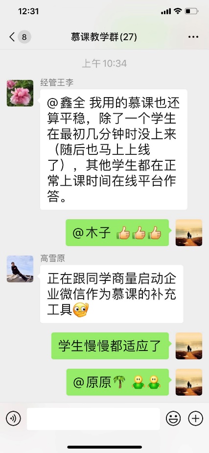 高雪原老师:我选择将MOOC平台与企业微信结合使用。基于MOOC平台可以充分利用网络学习资源,扩展学生的学习视野;基于企业微信能够实现实时讨论互动。首先利用企业微信和同学们实时互动,讲解本节课的学习目标和主要内容,然后移步MOOC平台,利用已有的网络资源进行学习,完成MOOC平台的学习后组织同学们再次回到企业微信,结合视频学习与教材中的内容进行实时互动讨论、答疑。线上课堂管理相比于线下课堂管理有一定的难度,需要老师在课堂管理后台关注学生的参与情况,并仔细对每位同学进行核对。