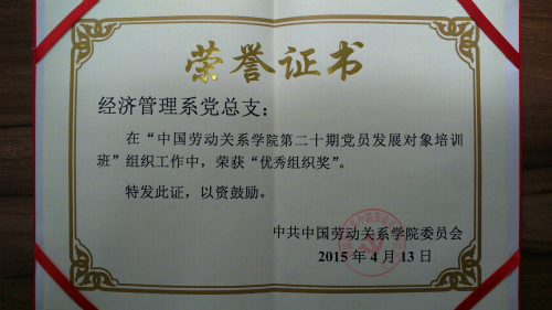 根据我系在培训班的组织和开展中取得成果,经学院党委评定,我系党总支获得“优秀组织奖”。