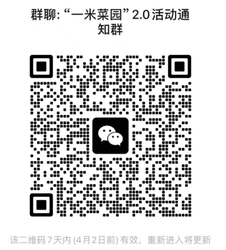 1.有意愿参与活动的同学填写附件《“耕读小院”一米菜园2.0认养申请表》,发送至邮箱2176193983@qq.com,同时扫码加入活动官方群聊。