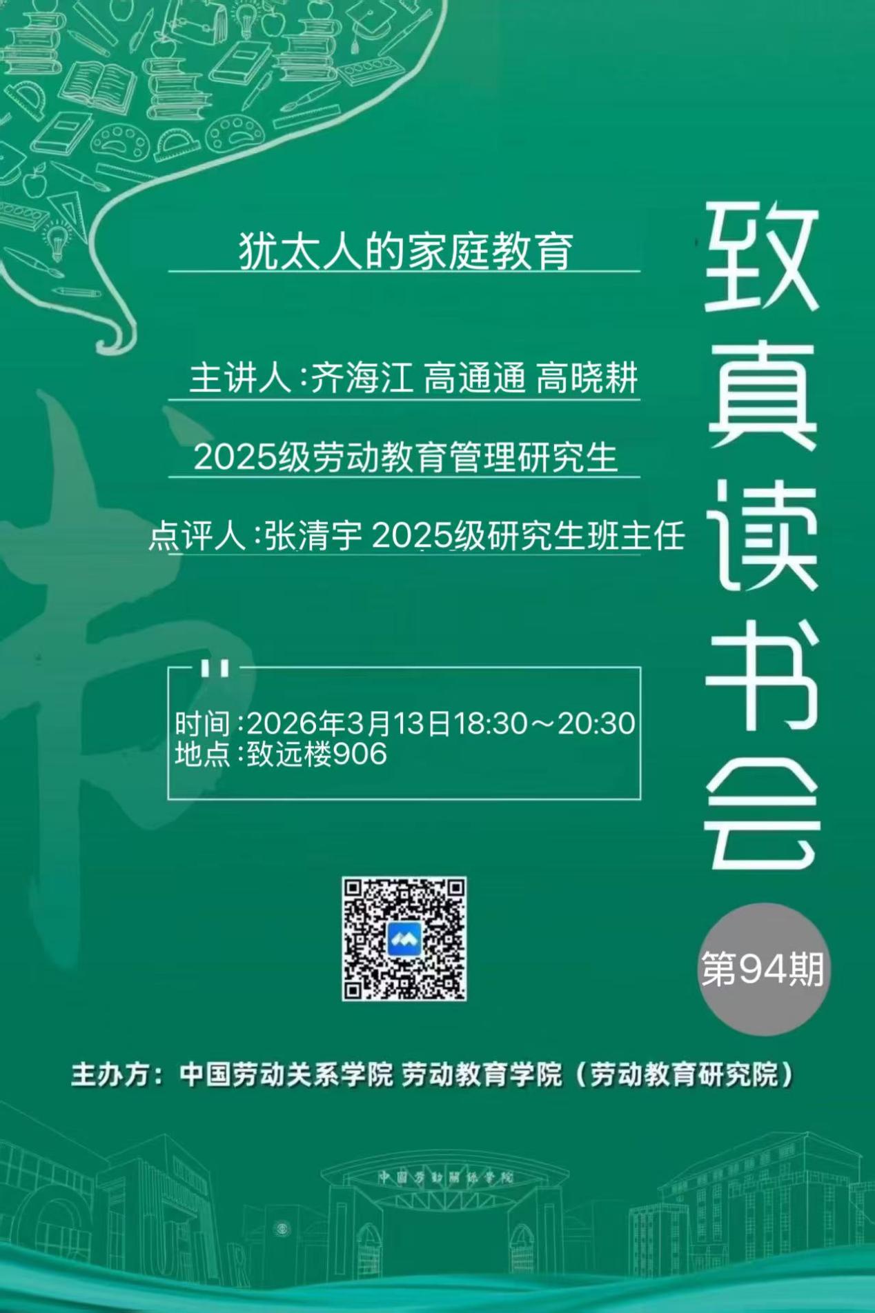 2026年3月13日晚,劳动教育学院在致远楼906举办第94期研究生“致真读书会”,2025级全体研究生参会。本期读书会学习经典著作:《犹太人的家庭教育》。