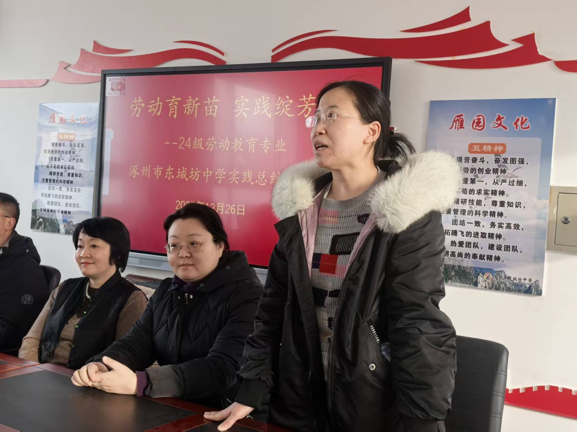 “心声•成长”环节中,优秀实习生代表邓迪、杜东宇、魏珠珠依次发言。三位同学分别分享了实习期间最难忘的教学经历、与学生相处的温暖瞬间,以及在课堂管理、技能传授等方面的收获与感悟,真挚表达了对东城坊中学师生悉心指导与包容支持的感谢,言语间满是对劳动教育事业的热爱与责任。