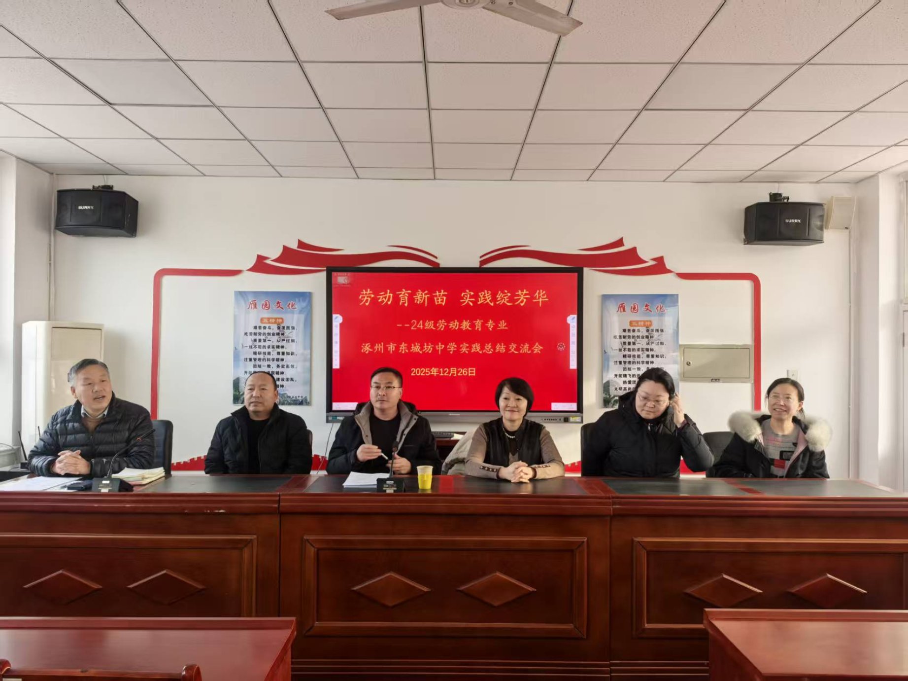 为总结劳动教育实践成果,深化校际合作育人机制,12月26日,劳动教育学院2024级劳动教育专业东城坊中学实践总结交流会在东城坊中学大会议室召开。东城坊中学陈学、刘耀军、郑艳宾、张艳玲等领导老师,劳动教育学院曲霞、杨阳、张清宇、王慧,以及劳动教育专业2024级全体本科生共同参会,会议由东城坊中学副校长刘耀军主持。