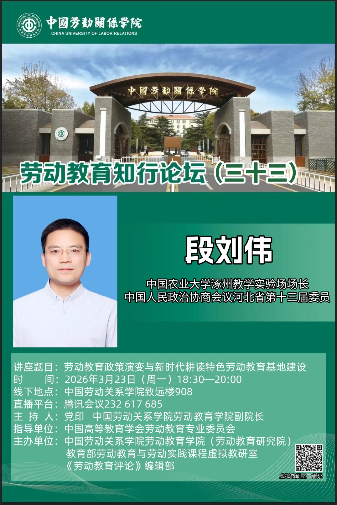 2026年3月23日,在中国高等教育学会劳动教育专委会的指导下,教育部劳动教育与劳动实践课程虚拟教研室与中国劳动关系学院教育学院(劳动教育研究院)、《劳动教育评论》编辑部联合举办第三十三期“劳动教育知行论坛”。本次论坛线上线下同时进行,100余名来自中国劳动关系学院的师生及全国多所高校的教师和研究人员参与此次论坛。