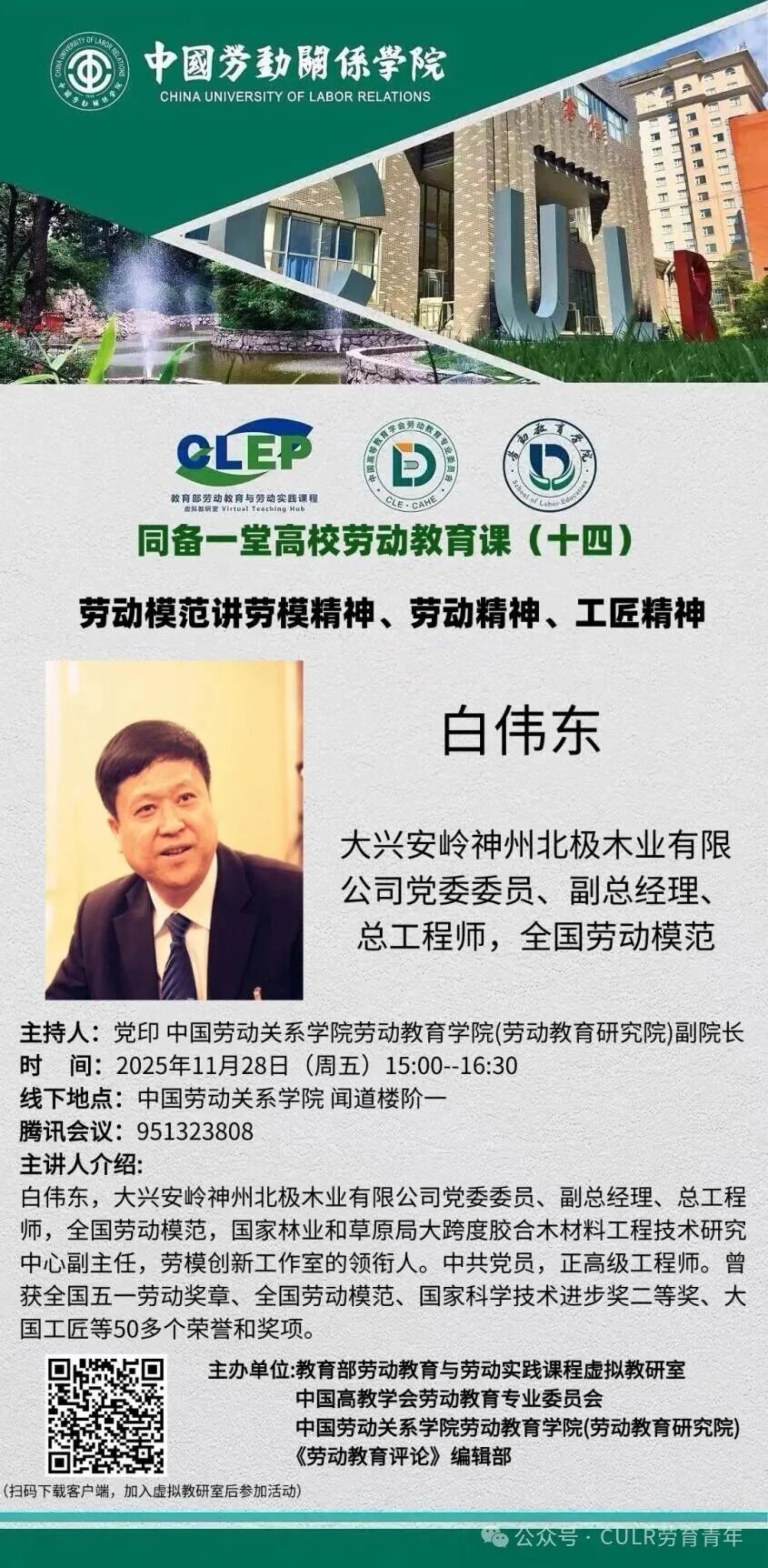 2025年11月28日下午,为进一步加强劳动教育课程建设,促进交流,汇聚共识,教育部劳动教育与劳动实践课程虚拟教研室在中国高等教育学会劳动教育专业委员会的指导下,与中国劳动关系学院劳动教育学院(劳动教育研究院)联合在线举办"同备一堂高校劳动教育课"系列活动之第十四次跨校集体教研。本次教研活动由大兴安岭神州北极木业有限公司党委委员、副总经理、总工程师,全国劳动模范白伟东主讲,主讲内容为"劳动模范讲劳模精神、劳动精神、工匠精神",来自全国多所高校的100余名劳动教育教师和学生参与线下线上集体教研。