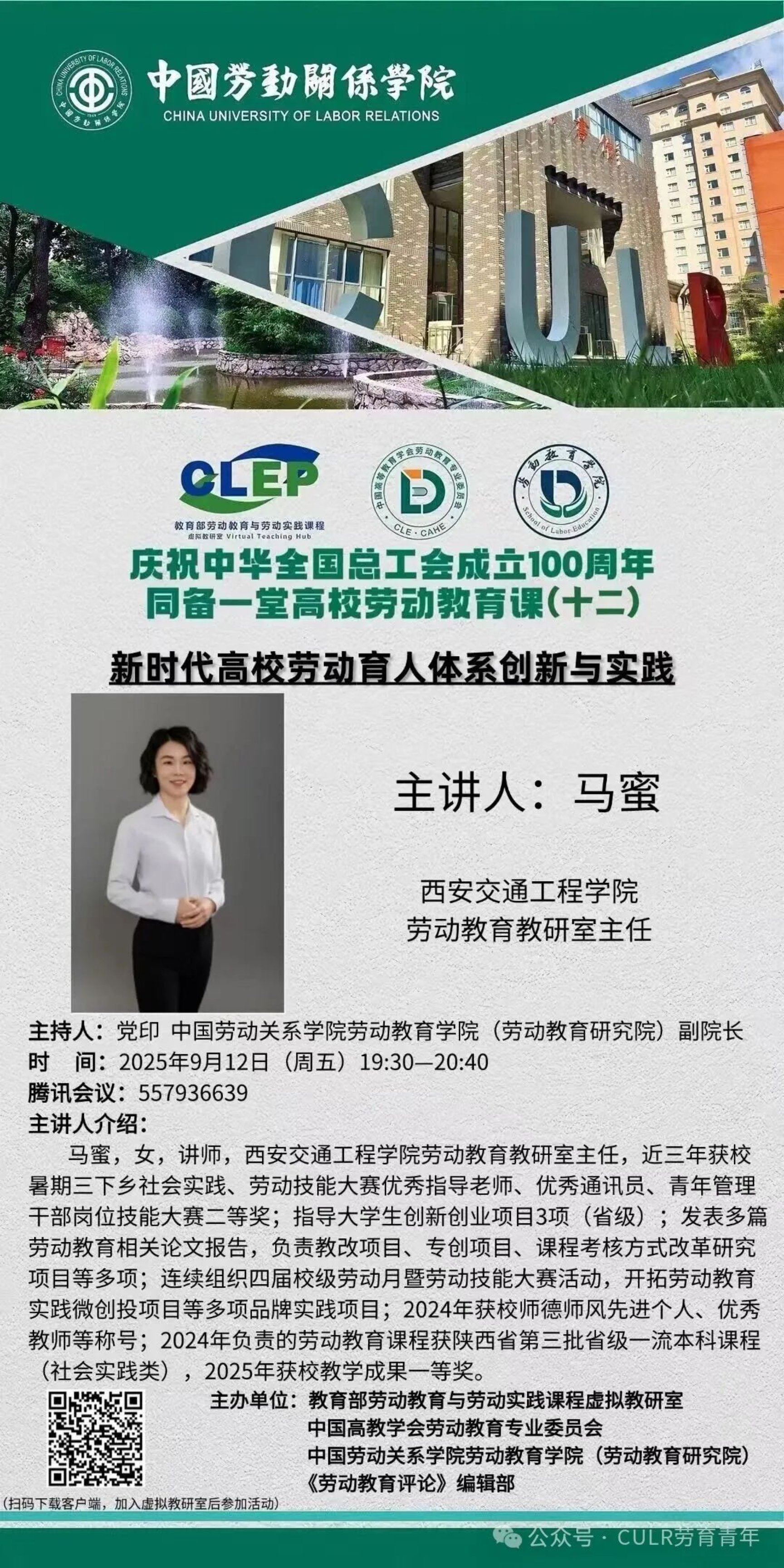 2025年9月12日晚,为进一步加强劳动教育课程建设,促进交流,汇聚共识,教育部劳动教育与劳动实践课程虚拟教研室在中国高等教育学会劳动教育专业委员会的指导下,与中国劳动关系学院劳动教育学院(劳动教育研究院)联合在线举办"同备一堂高校劳动教育课"系列活动之第十二次跨校集体教研。本次教研活动由西安交通工程学院劳动教育教研室主任马蜜主讲,主讲内容为"新时代高校劳动育人体系创新与实践",来自全国多所高校的300余名劳动教育教师和学生参与线上集体教研。