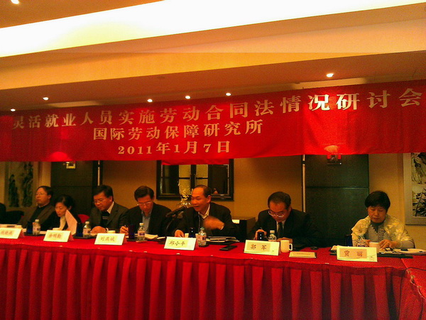 由人力资源和社会保障部国际劳动保障研究所主办的“灵活就业人员实施劳动合同法情况研讨会”于2011年1月7日在北京举行。研讨会由国际所刘燕斌所长主持,人社部劳动关系司邱小平司长、法规司余明勤副司长、全总民主管理部郭军部长及人社部国际所、劳科所和中国人民大学劳动人事学院、首都经贸大学劳动经济学院、中国劳动关系学院的专家学者30余人参加了研讨会。研讨会主要围绕着国际所新近完成的灵活就业人员实施劳动合同法情况的课题报告,其中主要是非全日制就业、劳务派遣和微小企业就业人员的现状。问题、成因及对策进行探讨。
