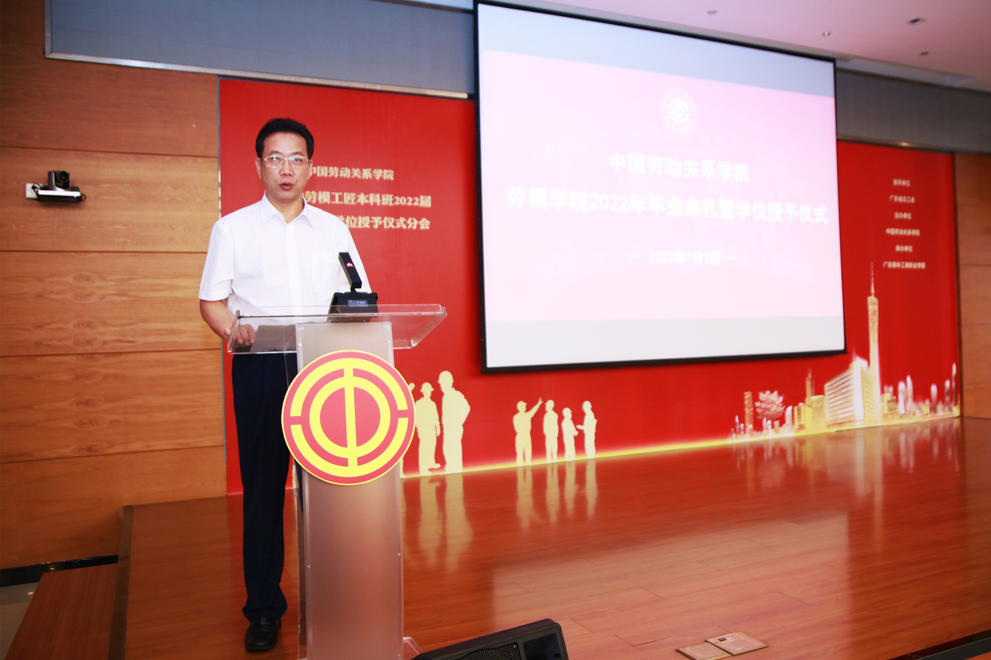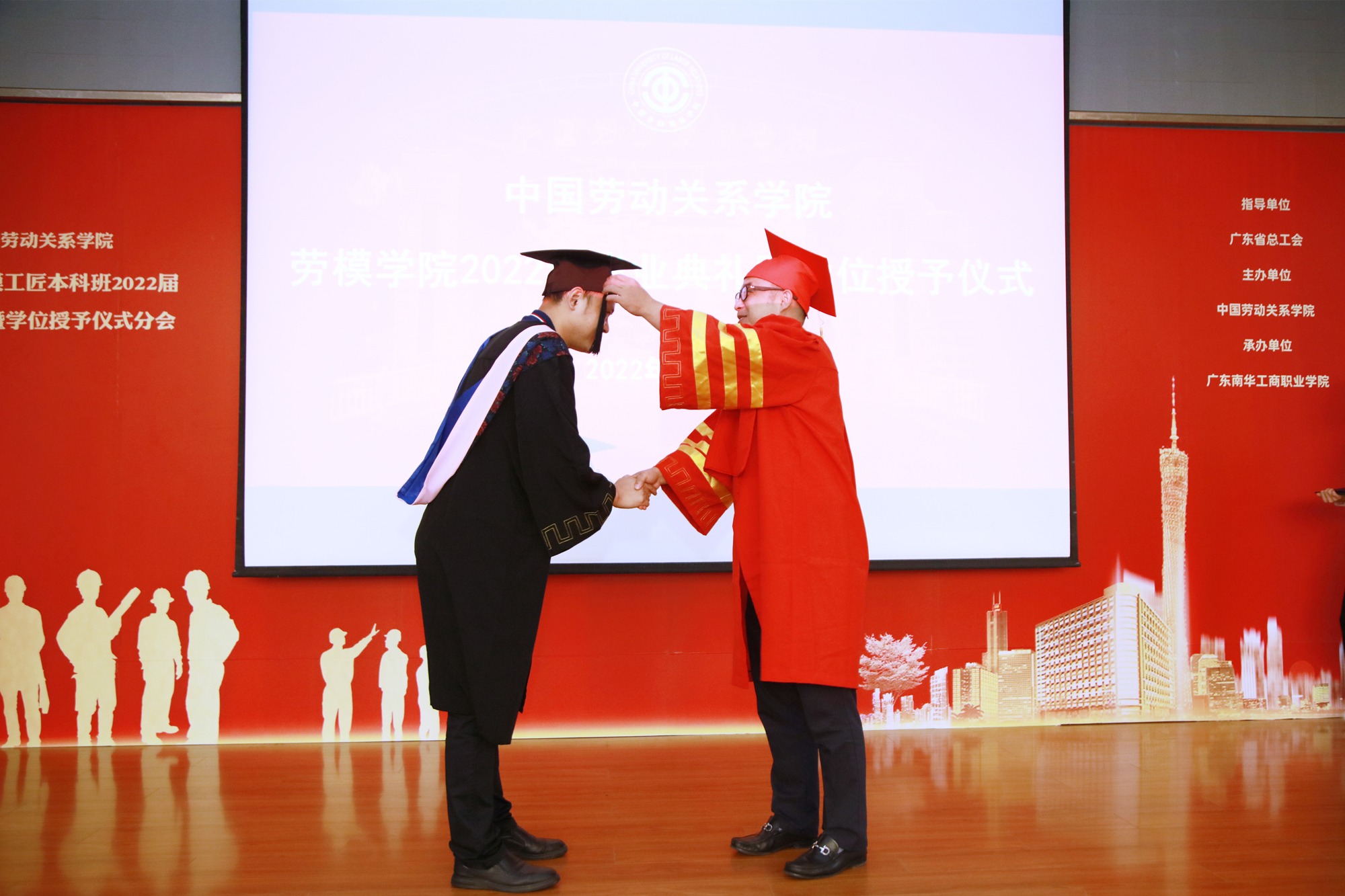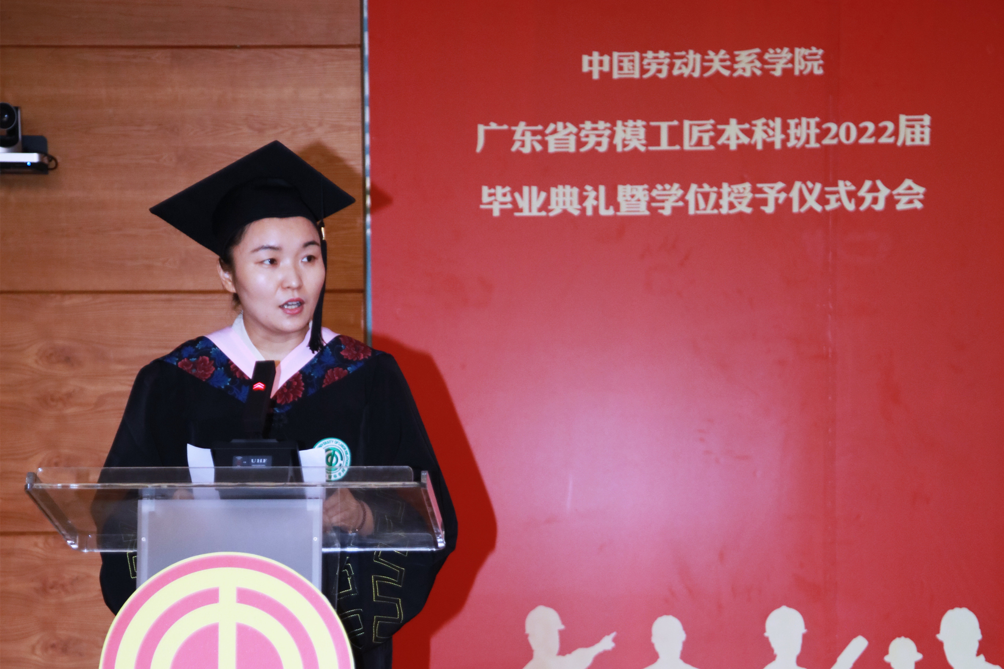 典礼上,劳模学院院长纪元宣读了《中国劳动关系学院2022届劳模本科毕业生资格审查及学士学位授予决定》。2018级社会工作专业学生、全国劳动模范、北京环卫集团蔡凤辉作为毕业生代表,深情回顾了2018级全体同学给习近平总书记写信、收到回信、学习回信、宣讲回信的全过程,并表示,总书记的回信、学校的培养教育,令人终生难忘。正是在大学的学习,使自己有了蜕变的机会和底气。2020级广东班人力资源管理专业、第十三届全国人大代表、广汽本田汽车有限公司李先兰作为毕业生代表,在发言中表示,通过两年多系统学习,自己受益颇多。取得的一系列成绩,得益于工会各级领导和学校老师们无微不至地关怀和鼓励,得益于劳模同学们的自律与努力。文化传播学院教师杨宁作为教师代表,寄语2022届劳模本科毕业生,希望每位劳模毕业生都能秉持正义的力量,用真、善、美推动社会的发展。能够“永葆初心”,坚守人类的基本美德,在自己的岗位上继续发光发热,做出自己的一番成就。