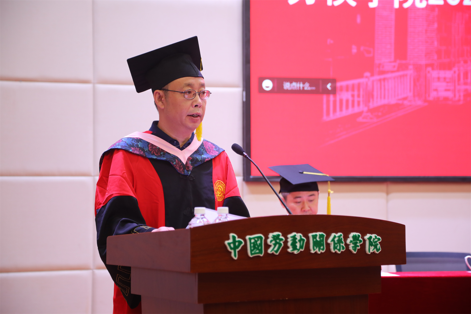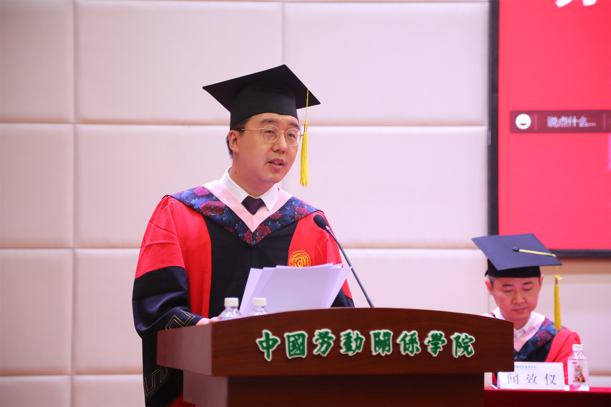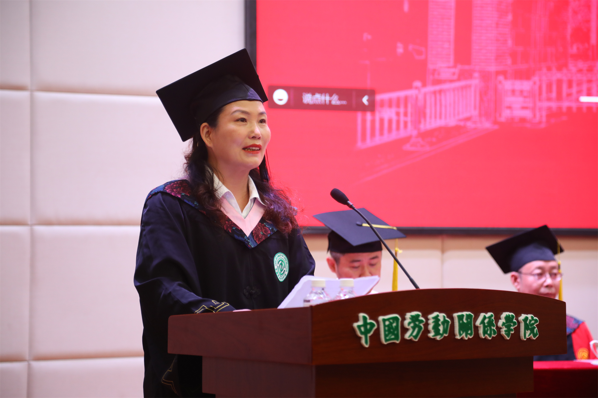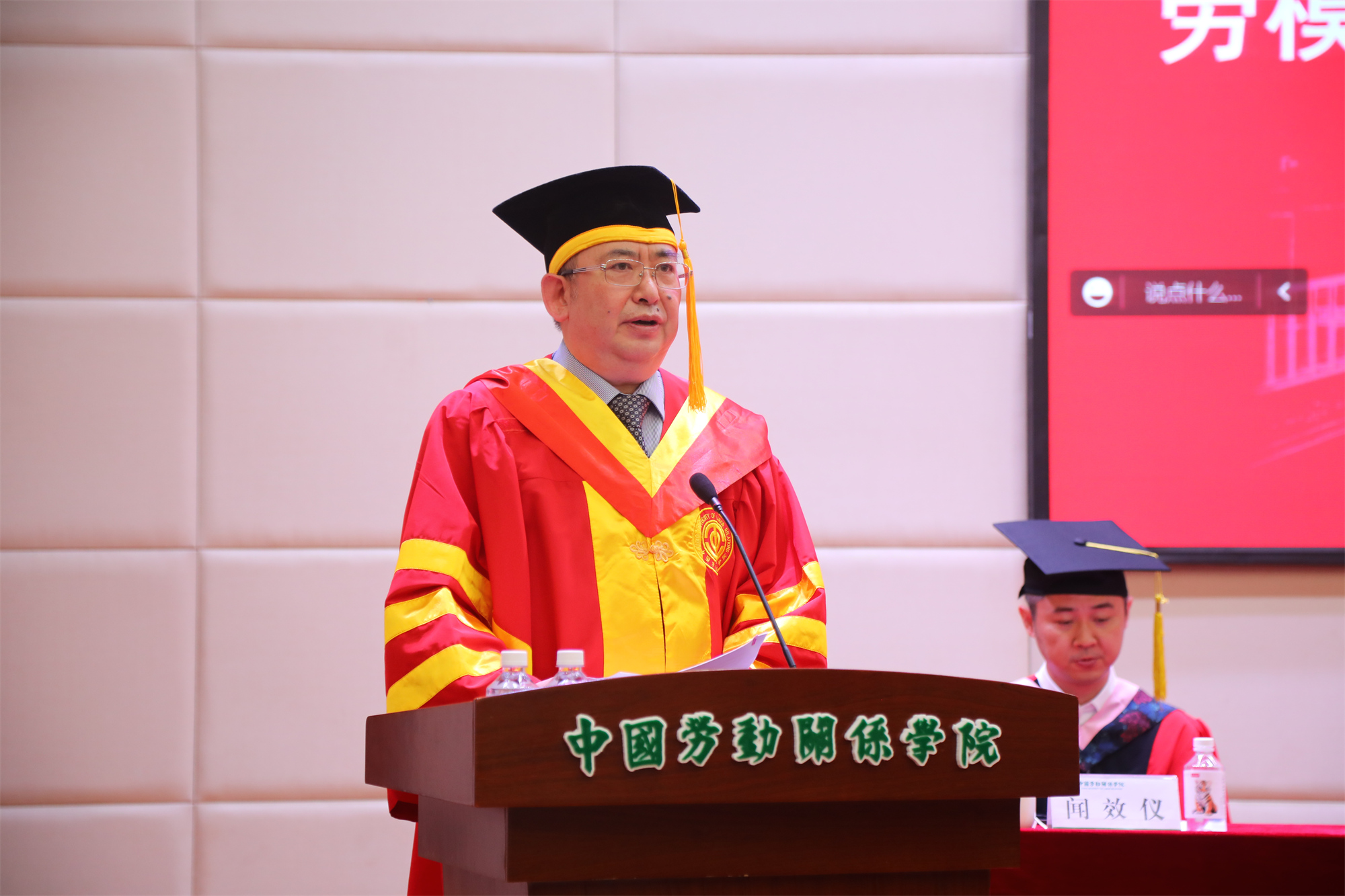 典礼上,劳模学院院长纪元宣读了《中国劳动关系学院2022届劳模本科毕业生资格审查及学士学位授予决定》。2018级社会工作专业学生、全国劳动模范、北京环卫集团蔡凤辉作为毕业生代表,深情回顾了2018级全体同学给习近平总书记写信、收到回信、学习回信、宣讲回信的全过程,并表示,总书记的回信、学校的培养教育,令人终生难忘。正是在大学的学习,使自己有了蜕变的机会和底气。2020级广东班人力资源管理专业、第十三届全国人大代表、广汽本田汽车有限公司李先兰作为毕业生代表,在发言中表示,通过两年多系统学习,自己受益颇多。取得的一系列成绩,得益于工会各级领导和学校老师们无微不至地关怀和鼓励,得益于劳模同学们的自律与努力。文化传播学院教师杨宁作为教师代表,寄语2022届劳模本科毕业生,希望每位劳模毕业生都能秉持正义的力量,用真、善、美推动社会的发展。能够“永葆初心”,坚守人类的基本美德,在自己的岗位上继续发光发热,做出自己的一番成就。