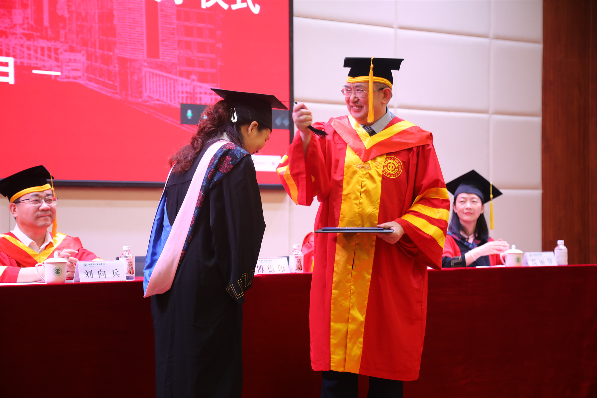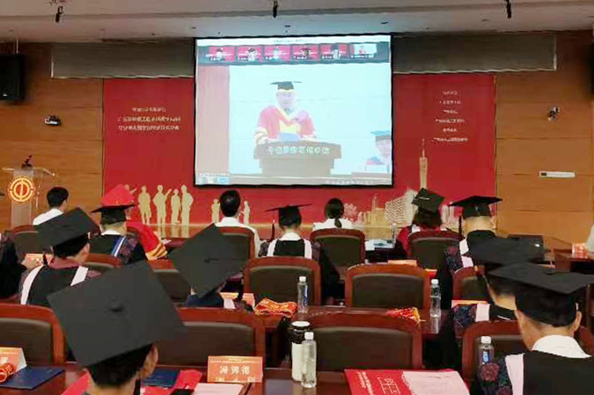 在北京主会场,傅德印校长为毕业生代表扶正流苏,颁发毕业证书和学位证书。在广东分会场,马栩生校长为广东劳模班毕业生代拨流苏、代发证书。五湖四海的劳模毕业生在云端由亲朋好友代为扶苏正冠。