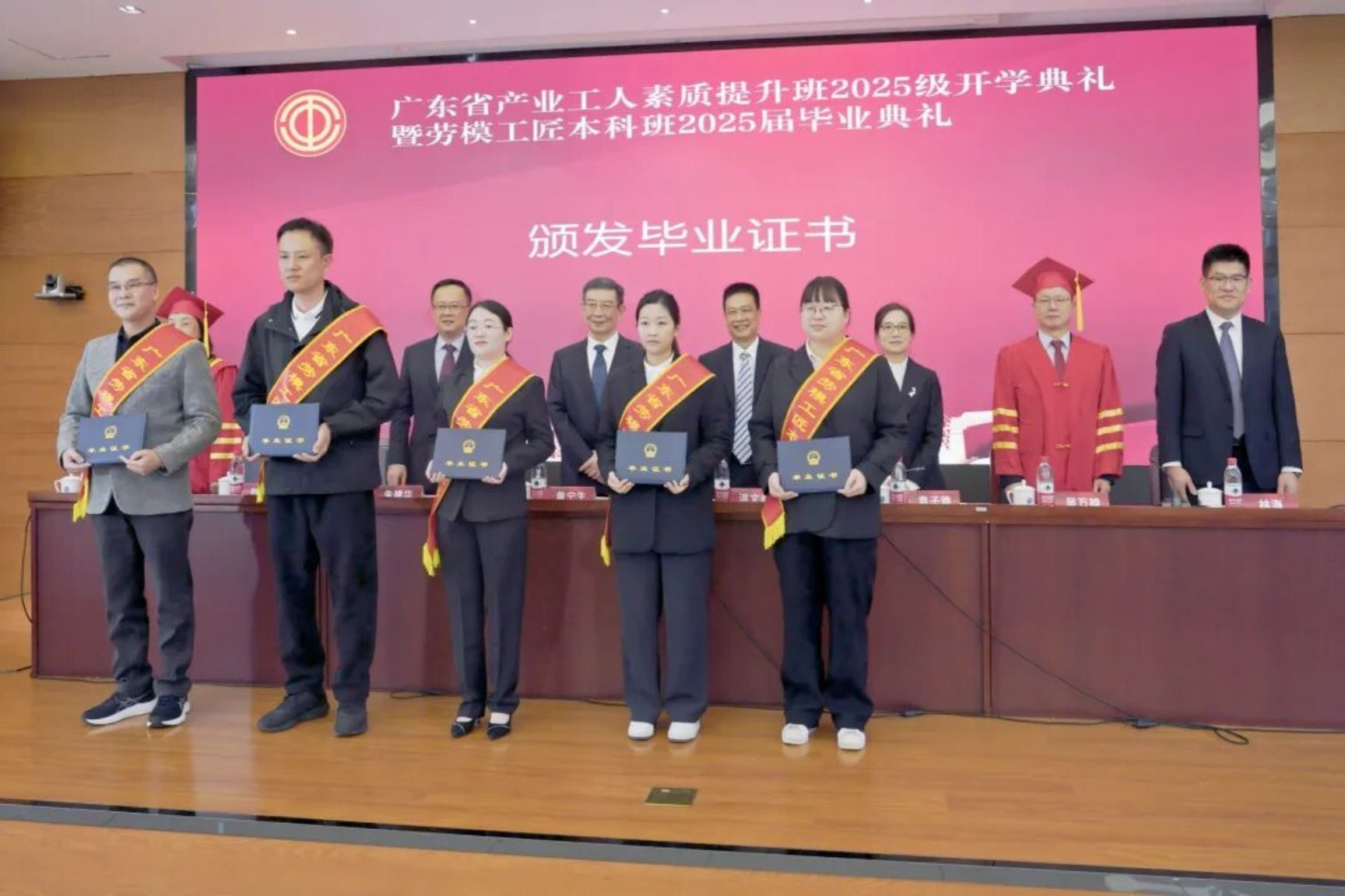 11月19日,广东省产业工人素质提升班2025级开学典礼暨劳模工匠本科班2025届毕业典礼在广东南华工商职业学院举行。广东省人大常委会党组副书记、省总工会主席黄宁生,我校党委常委、副校长吴万雄,广东开放大学、南方医科大学、广东南华工商职业学院等主办单位相关领导出席活动,我校劳模学院教师代表,广东劳模工匠本科班毕业生、新生代表参加典礼。