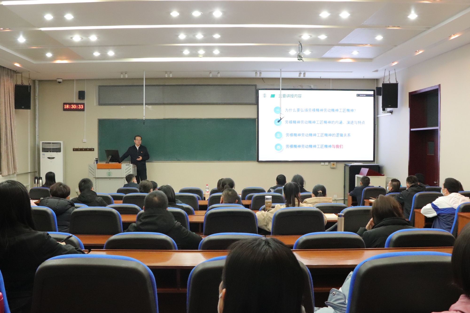 讲座中,刘向兵书记结合党的二十大报告精神和全国“两会”精神,通过丰富的历史资料和详实数据,旁征博引,从弘扬劳模精神劳动精神工匠精神的重要意义,劳模精神劳动精神工匠精神的内涵演进与特点、内在逻辑关系等方面进行了深入浅出的讲解。他指出,劳模精神、劳动精神、工匠精神是中国共产党精神谱系中的重要内容,是伟大创造精神、伟大奋斗精神、伟大团结精神、伟大梦想精神在工人阶级群体中的生动体现,是激励全党全国各族人民面向新征程、展现新作为的重要精神动力。他强调,新征程更需要昂扬的劳动精神面貌,鲜明的劳动价值导向,精湛的劳动技能水平。他希望,劳模学生要以三种精神为旗帜,做引领社会风尚的“先锋队”、推进创新发展的“排头兵”、推动劳动教育的“生力军”、支持学校建设的“轻骑兵”和促进学业进步的“佼佼者”,练就贯彻新发展理念、构建新发展格局的真功夫、硬本领,进一步在学校发展中发挥独特优势,在全社会讲好劳模故事、工匠故事,为实现中国式现代化贡献榜样力量。