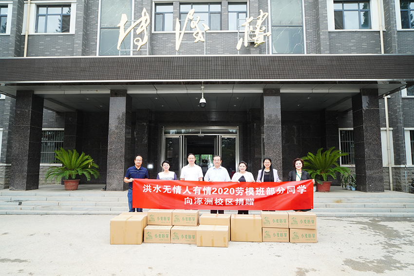 8月11日下午,2020级劳模学生安钟岩亲自将2020级劳模学生的爱心捐款23600元(大写:贰万叁仟陆佰元整)以及衬衫、T恤、食品等救灾物资送达涿州校区,我校党委书记刘向兵、副校长刘丽红、副校长吴万雄代表学校接收了善款和物资,并对劳模同学(校友)表示感谢。