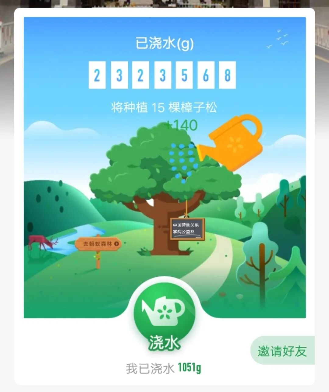 为响应北京市团委“蓝天保卫战,我是行动者”的倡议,社会工作学院团总支将居家运动打卡与“中国劳动关系学院公益林共建活动”相结合,鼓励同学们疫情期间做好防护的同时适当运动,用积累步数的方式收取能量为中国劳动关系学院公益林“浇水”。