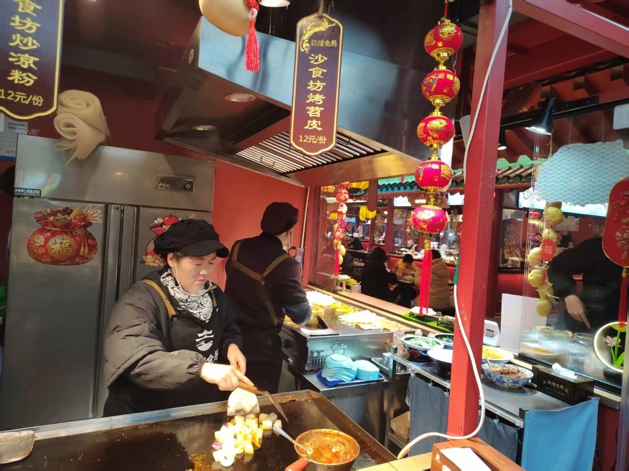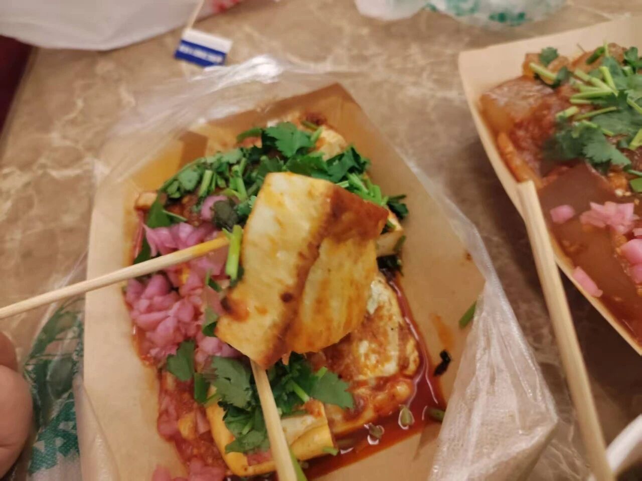 敦煌夜市晚上很热闹。我挤在人群里,看卖驴肉黄面的师傅挥舞着胳膊,看卖杏皮水的姑娘把琥珀色的液体倒进玻璃杯,看烤羊肉串的摊子冒着青烟,看炒凉粉和酸萝卜打架,看豆腐在铁板上躺平。到处都有人说话、笑、碰杯,到处都飘着孜然的香气。千百年前路过的异域客人或许也会剪下一把沙葱,扔进炒着鸡蛋的铁锅里,给夜晚的餐食添一份辛香。夜市越夜越深,举着糖葫芦的小孩从身边跑过,举着手机直播的年轻人对着镜头大声说话。灯火,人影,香气,声音,混在一起从眼前流过,热热闹闹的,又有点恍惚惚的。
