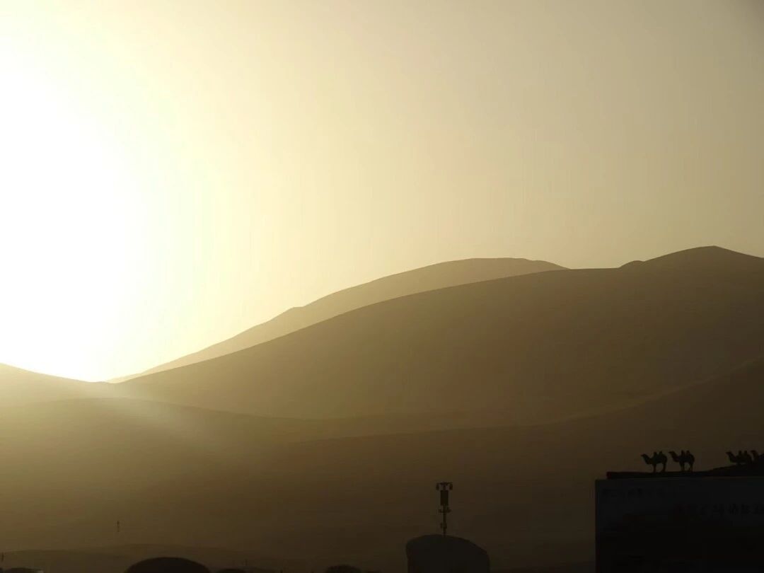 太阳正在落山,把整片沙漠染成金红色。如果顺着斜坡往下滚,一圈,两圈,滚到底下站起来,浑身都会是金色的粉末,抖一抖,落下来的细沙在阳光下闪闪发光,像是把一小片沙漠带在了身上。我的影子被拉得很长,投在沙地上,和骆驼的影子叠在一起。