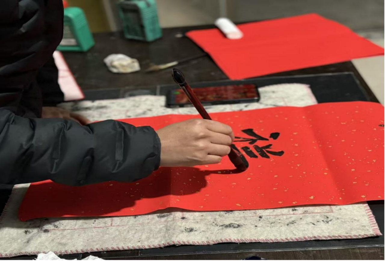 晚上7点左右,小姨终于来了。我跟着小姨学习手写春联。墨香缭绕间,小姨一笔一画耐心指导,完全是鼓励式教育,教我每一个笔画、笔锋该怎么走。小姨练的是隶书,她说隶书的收笔直接起,不用顿笔。因为我总是忘记,所以对这句话尤其熟悉。小姨对我严格要求,但每当我准备放弃,她总会鼓励我看,甚至会和我一起写同一幅对联。她感慨道:“愿意学就是好的,现在好多年轻人嫌麻烦、不愿学,传统书法慢慢就荒废了。”这句话深深触动了我,这不再是课堂上新奇的非遗体验,而是刻在血脉里的文化传承,是长辈对传统文化延续的期盼,一笔一画,都将“家”与“根”写进心底。